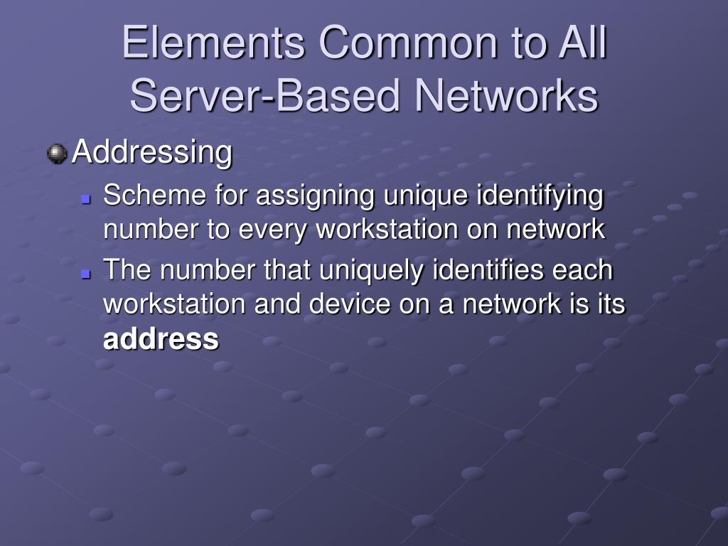 Elements Common to AllServer-Based Networks • Addressing • Scheme for assigning unique identifying number to every workstation on network • The number that uniquely identifies each workstation and device on a network is its address