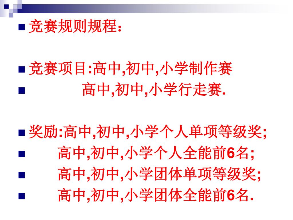 竞赛规则规程: • 竞赛项目:高中,初中,小学制作赛 • 高中,初中,小学行走赛. • 奖励:高中,初中,小学个人单项等级奖; • 高中,初中,小学个人全能前6名; • 高中,初中,小学团体单项等级奖; • 高中,初中,小学团体全能前6名.