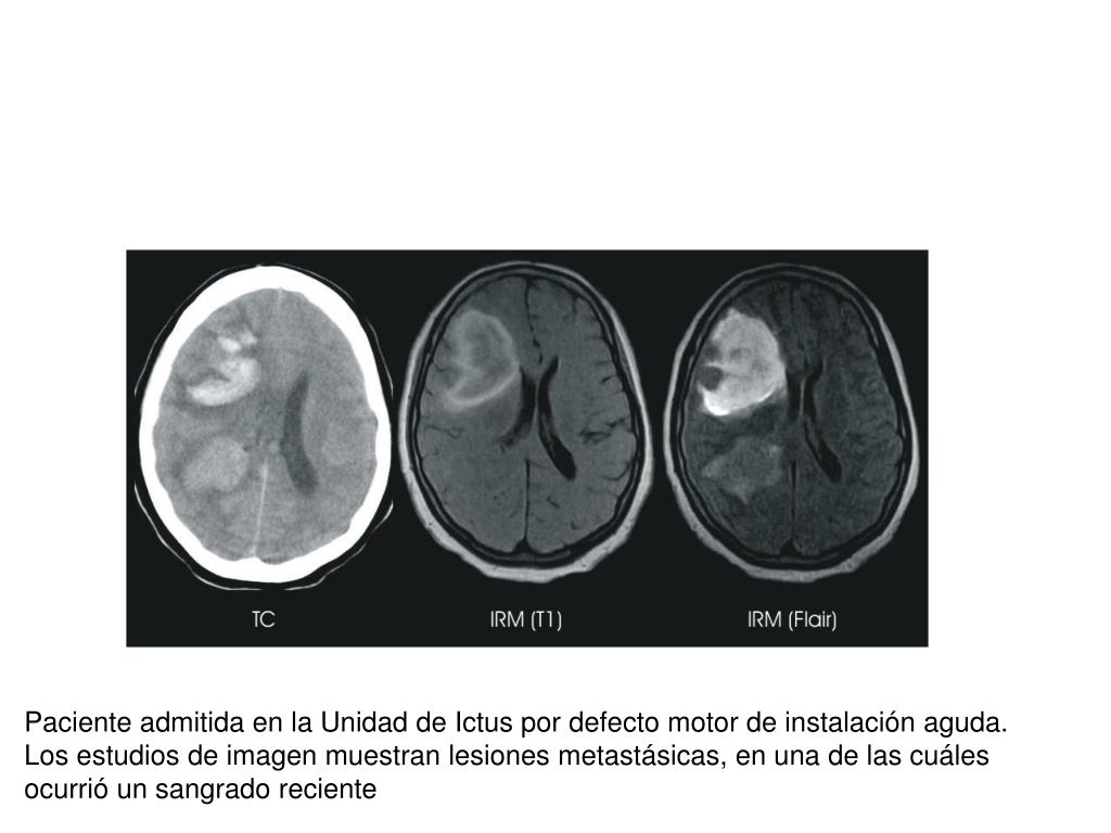 Paciente admitida en la Unidad de Ictus por defecto motor de instalación aguda. Los estudios de imagen muestran lesiones metastásicas, en una de las cuáles ocurrió un sangrado reciente