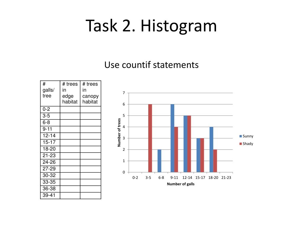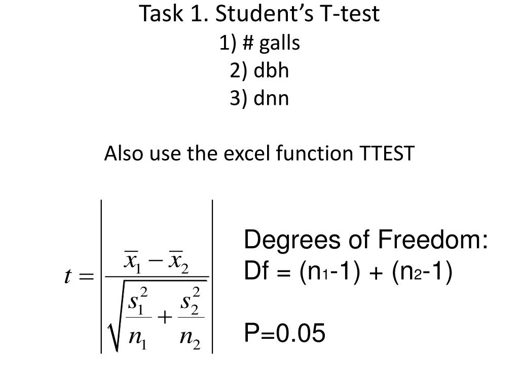 Task 1. Student’s T-test1) # galls2) dbh3) dnnAlso use the excel function TTEST Degrees of Freedom: Df = (n1-1) + (n2-1) P=0.05