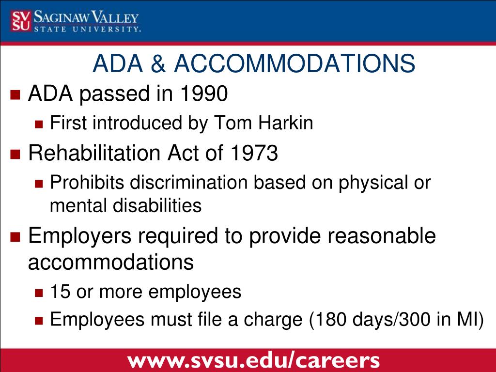 ADA passed in 1990 First introduced by Tom Harkin Rehabilitation Act of 1973 Prohibits discrimination based on physical or mental disabilities Employers required to provide reasonable accommodations 15 or more employees Employees must file a charge (180 days/300 in MI) ADA & ACCOMMODATIONS www.svsu.edu/careers
