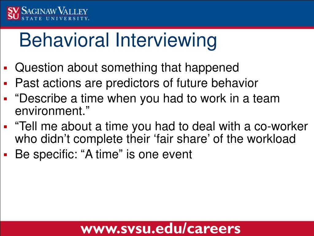 Behavioral Interviewing • Question about something that happened • Past actions are predictors of future behavior • “Describe a time when you had to work in a team environment.” • “Tell me about a time you had to deal with a co-worker who didn’t complete their ‘fair share’ of the workload • Be specific: “A time” is one event www.svsu.edu/careers