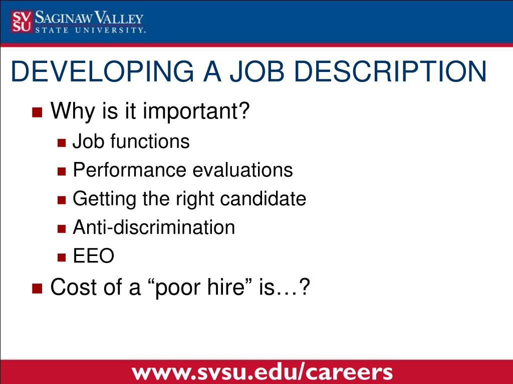 Why is it important? Job functions Performance evaluations Getting the right candidate Anti-discrimination EEO Cost of a “poor hire” is…? DEVELOPING A JOB DESCRIPTION www.svsu.edu/careers