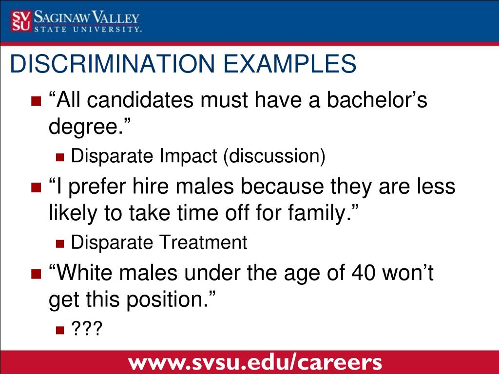 “All candidates must have a bachelor’s degree.” Disparate Impact (discussion) “I prefer hire males because they are less likely to take time off for family.” Disparate Treatment “White males under the age of 40 won’t get this position.” ??? DISCRIMINATION EXAMPLES www.svsu.edu/careers
