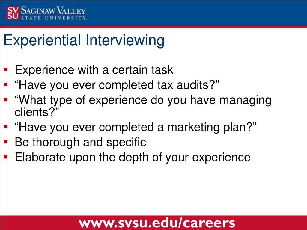 Experiential Interviewing • Experience with a certain task • “Have you ever completed tax audits?” • “What type of experience do you have managing clients?” • “Have you ever completed a marketing plan?” • Be thorough and specific • Elaborate upon the depth of your experience www.svsu.edu/careers