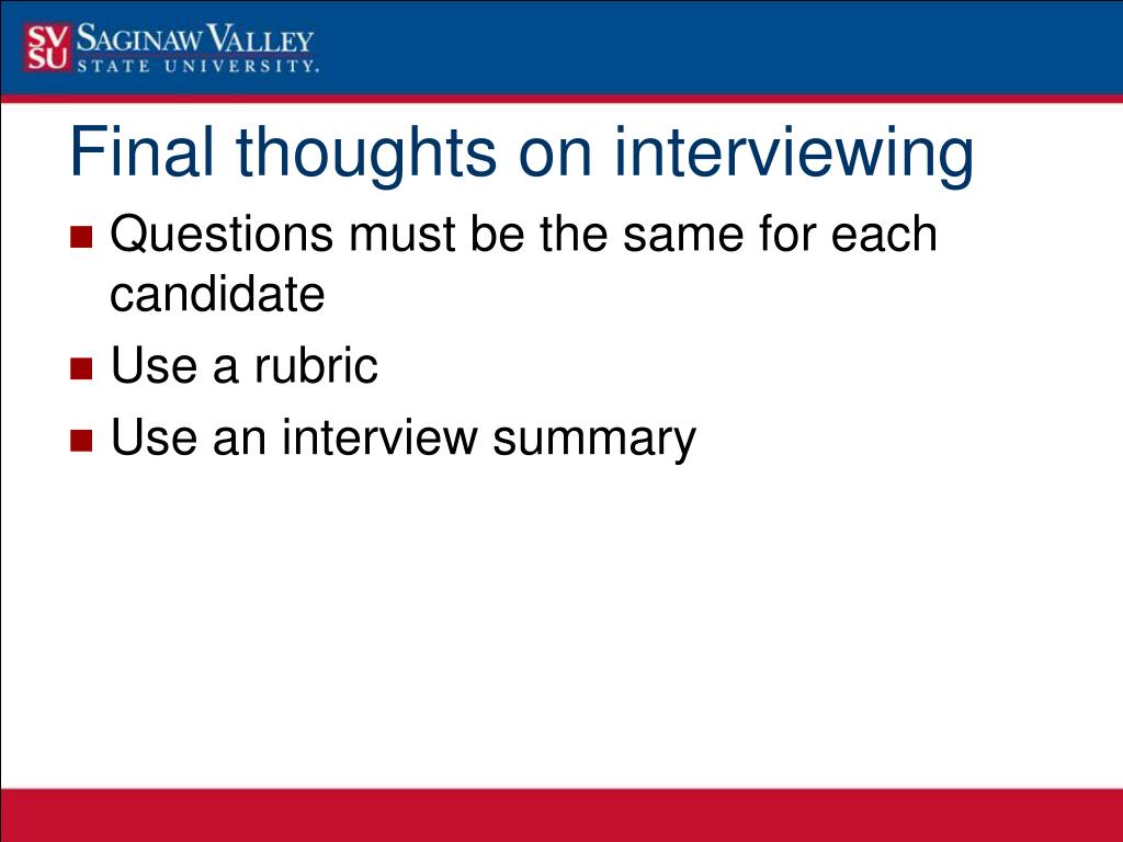 Questions must be the same for each candidate Use a rubric Use an interview summary Final thoughts on interviewing
