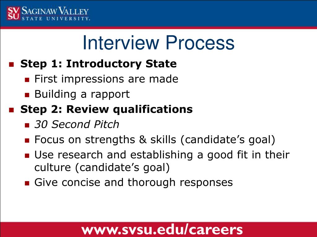Interview Process • Step 1: Introductory State • First impressions are made • Building a rapport • Step 2: Review qualifications • 30 Second Pitch • Focus on strengths & skills (candidate’s goal) • Use research and establishing a good fit in their culture (candidate’s goal) • Give concise and thorough responses www.svsu.edu/careers