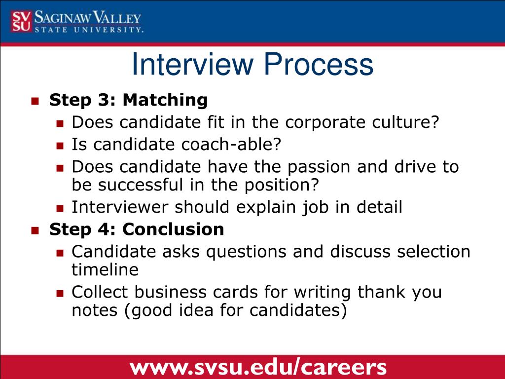 Interview Process • Step 3: Matching • Does candidate fit in the corporate culture? • Is candidate coach-able? • Does candidate have the passion and drive to be successful in the position? • Interviewer should explain job in detail • Step 4: Conclusion • Candidate asks questions and discuss selection timeline • Collect business cards for writing thank you notes (good idea for candidates) www.svsu.edu/careers
