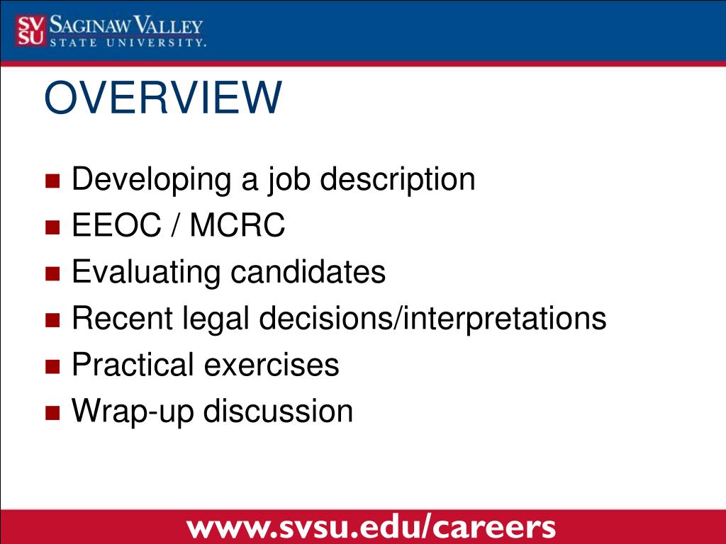 Developing a job description EEOC / MCRC Evaluating candidates Recent legal decisions/interpretations Practical exercises Wrap-up discussion OVERVIEW www.svsu.edu/careers