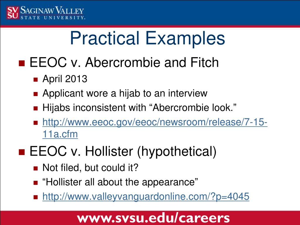 EEOC v. Abercrombie and Fitch April 2013 Applicant wore a hijab to an interview Hijabs inconsistent with “Abercrombie look.” http://www.eeoc.gov/eeoc/newsroom/release/7-15-11a.cfm EEOC v. Hollister (hypothetical) Not filed, but could it? “Hollister all about the appearance” http://www.valleyvanguardonline.com/?p=4045 Practical Examples www.svsu.edu/careers