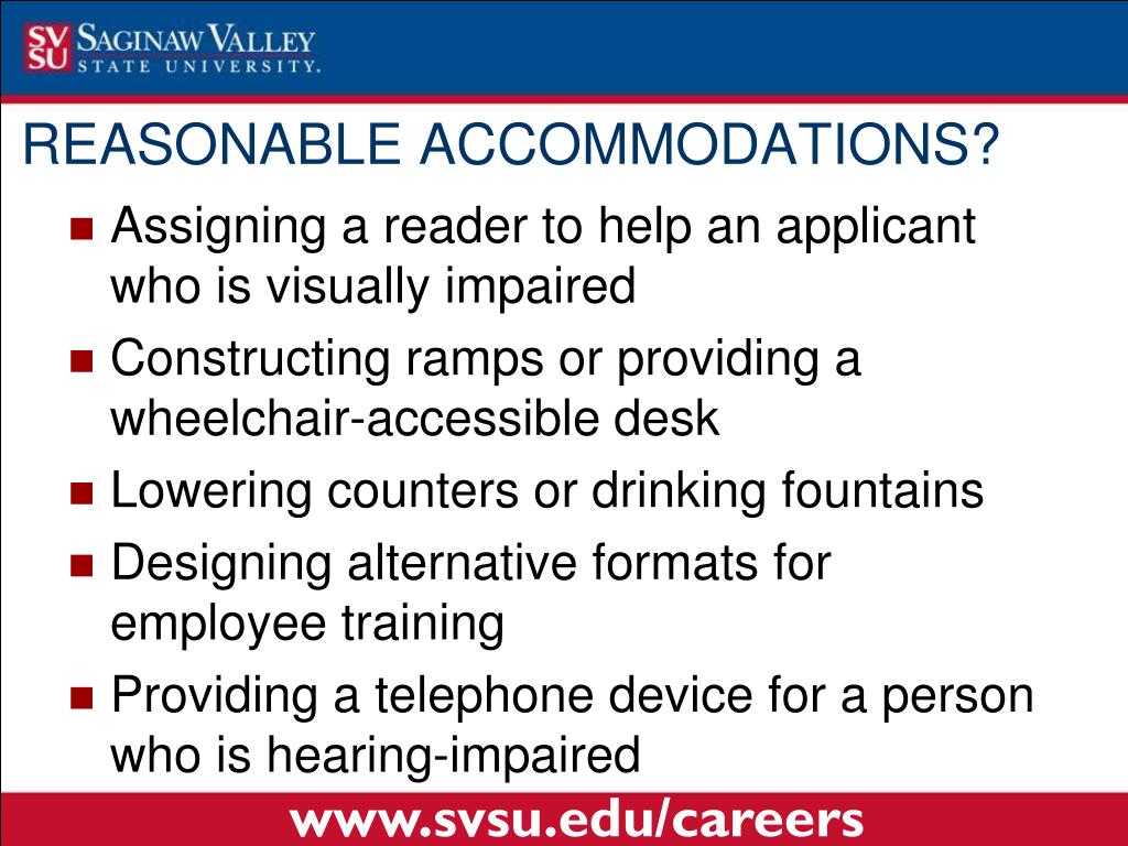 Assigning a reader to help an applicant who is visually impaired Constructing ramps or providing a wheelchair-accessible desk Lowering counters or drinking fountains Designing alternative formats for employee training Providing a telephone device for a person who is hearing-impaired REASONABLE ACCOMMODATIONS? www.svsu.edu/careers