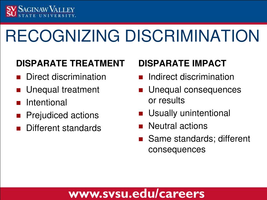 DISPARATE IMPACT RECOGNIZING DISCRIMINATION DISPARATE TREATMENT Direct discrimination Unequal treatment Intentional Prejudiced actions Different standards Indirect discrimination Unequal consequences or results Usually unintentional Neutral actions Same standards; different consequences www.svsu.edu/careers