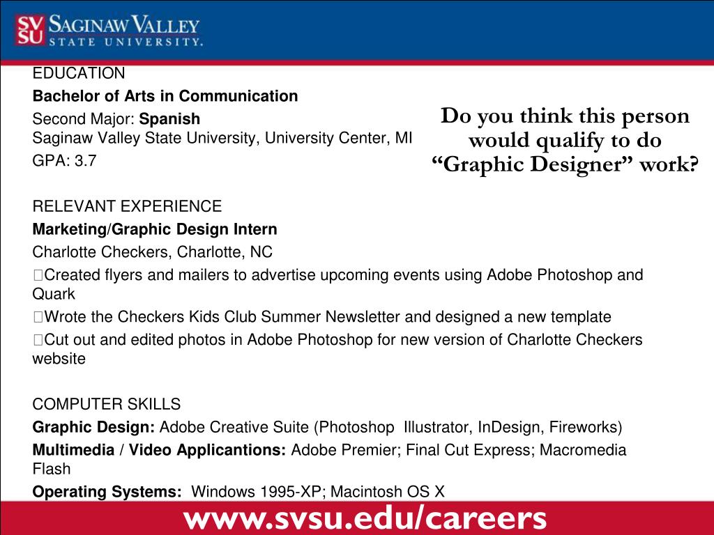 Do you think this person would qualify to do “Graphic Designer” work? EDUCATION Bachelor of Arts in Communication Second Major: SpanishSaginaw Valley State University, University Center, MI GPA: 3.7 RELEVANT EXPERIENCE Marketing/Graphic Design Intern Charlotte Checkers, Charlotte, NC Created flyers and mailers to advertise upcoming events using Adobe Photoshop and Quark Wrote the Checkers Kids Club Summer Newsletter and designed a new template Cut out and edited photos in Adobe Photoshop for new version of Charlotte Checkers website COMPUTER SKILLS Graphic Design: Adobe Creative Suite (Photoshop Illustrator, InDesign, Fireworks) Multimedia / Video Applicantions: Adobe Premier; Final Cut Express; Macromedia Flash Operating Systems: Windows 1995-XP; Macintosh OS X www.svsu.edu/careers