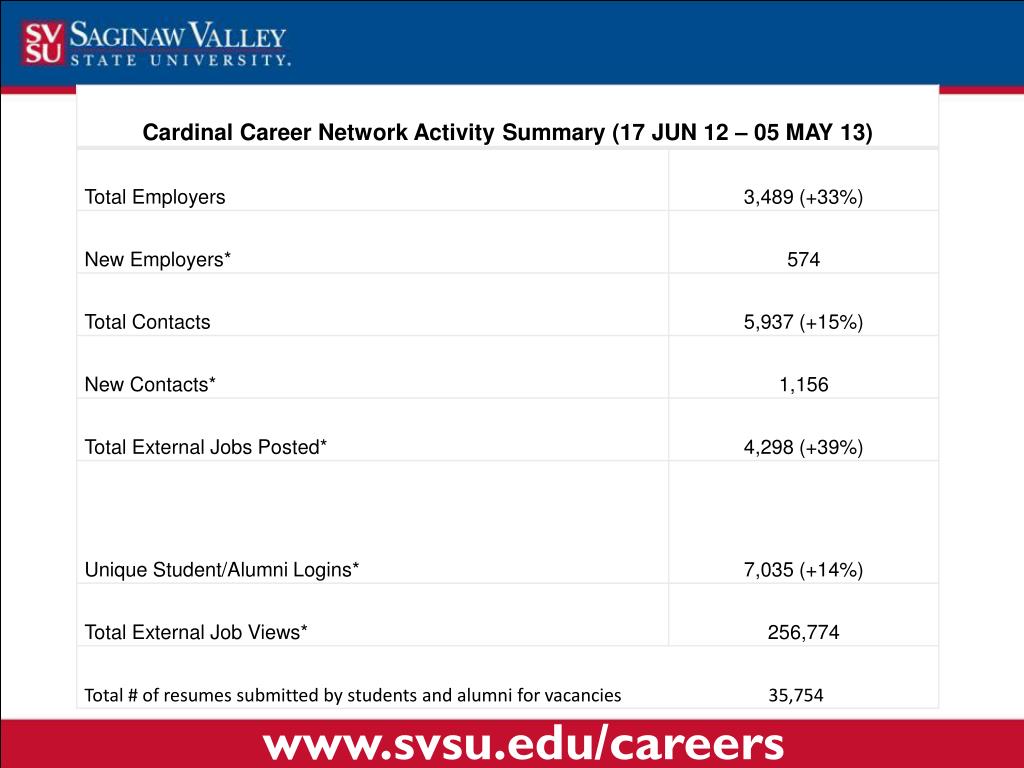 Cardinal Career Network Tips • Login at http://www.svsu.edu/careers • Cardinal Job Postings • Recruited / posted exclusively for SVSU • NACElink Extended Job Search • National Association of Colleges & Employers • Create Job Search Agents • Personalize resumes/cover letters for positions that accept them in CCN www.svsu.edu/careers