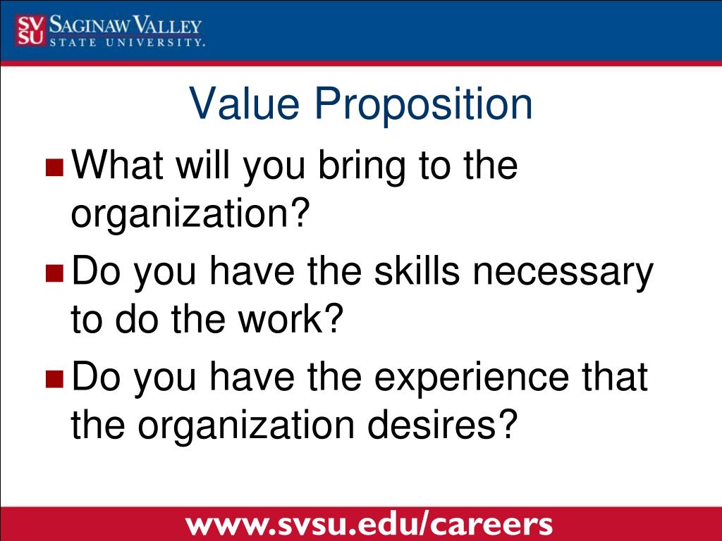 Value Proposition • What will you bring to the organization? • Do you have the skills necessary to do the work? • Do you have the experience that the organization desires? www.svsu.edu/careers