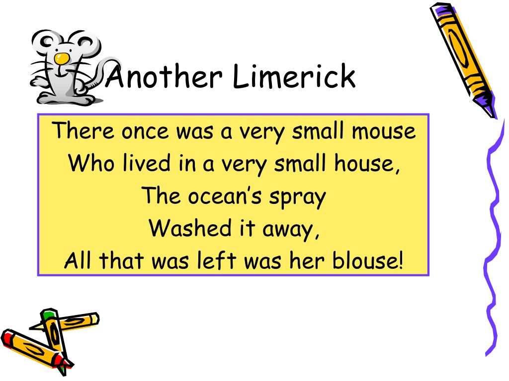 Another Limerick There once was a very small mouse Who lived in a very small house, The ocean’s spray Washed it away, All that was left was her blouse!