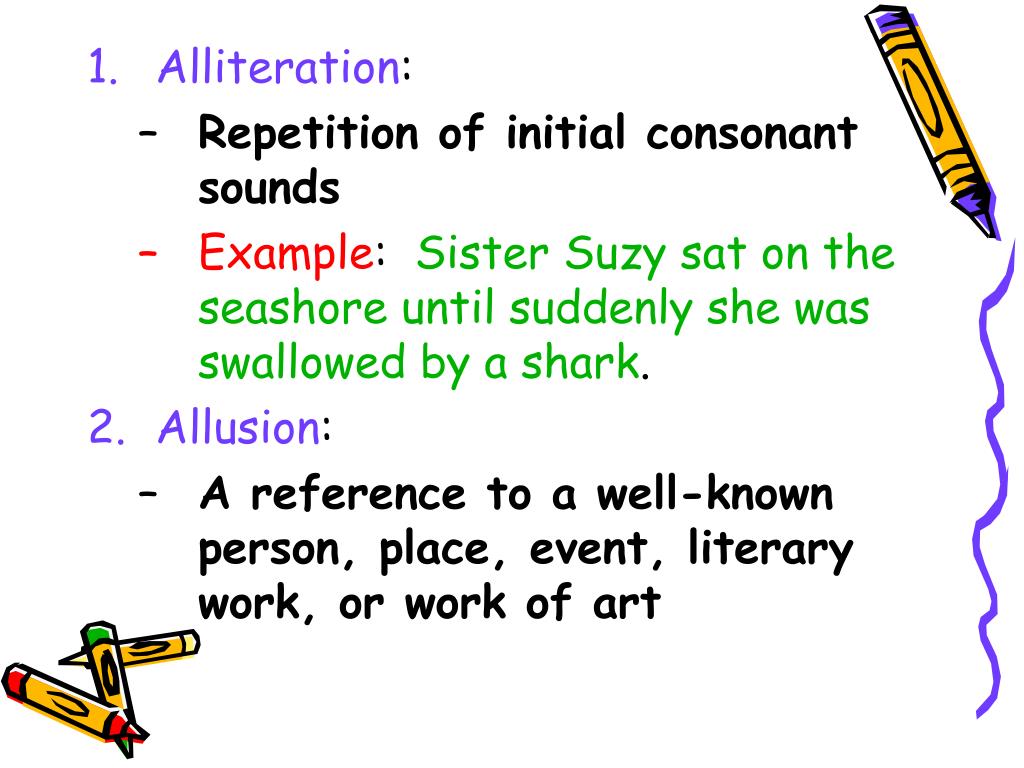 Alliteration: • Repetition of initial consonant sounds • Example: Sister Suzy sat on the seashore until suddenly she was swallowed by a shark. • Allusion: • A reference to a well-known person, place, event, literary work, or work of art