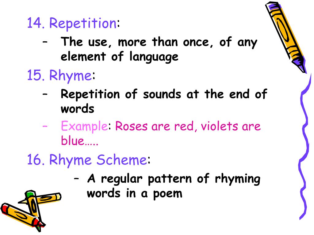 14. Repetition: • The use, more than once, of any element of language 15. Rhyme: • Repetition of sounds at the end of words • Example: Roses are red, violets are blue….. 16. RhymeScheme: • A regular pattern of rhyming words in a poem