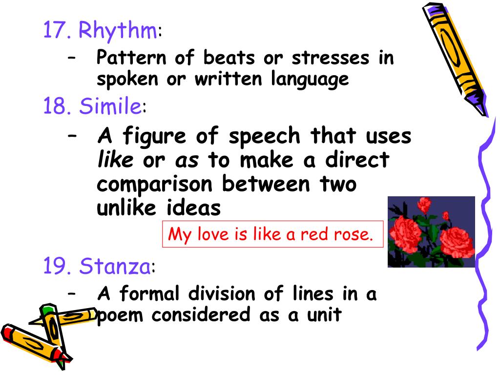 17. Rhythm: • Pattern of beats or stresses in spoken or written language 18. Simile: • A figure of speech that uses like or as to make a direct comparison between two unlike ideas 19. Stanza: • A formal division of lines in a poem considered as a unit My love is like a red rose.