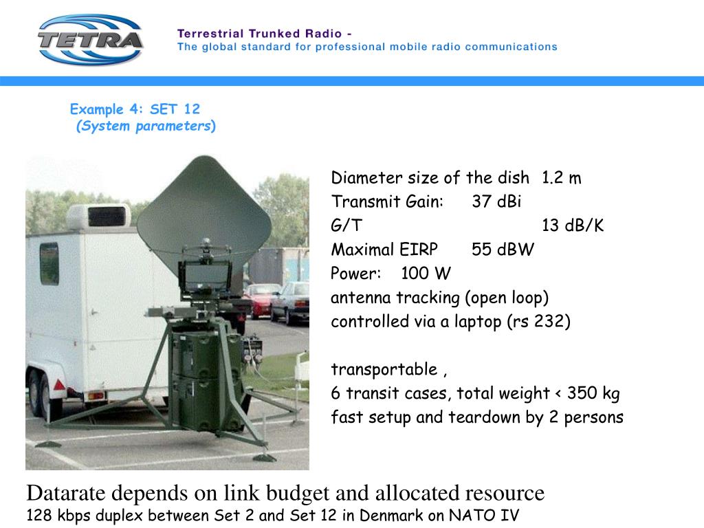 Example 4: SET 12(System parameters) • Diameter size of the dish 1.2 m • Transmit Gain: 37 dBi • G/T 13 dB/K • Maximal EIRP 55 dBW • Power: 100 W • antenna tracking (open loop) • controlled via a laptop (rs 232) • transportable , • 6 transit cases, total weight < 350 kg • fast setup and teardown by 2 persons Datarate depends on link budget and allocated resource 128 kbps duplex between Set 2 and Set 12 in Denmark on NATO IV