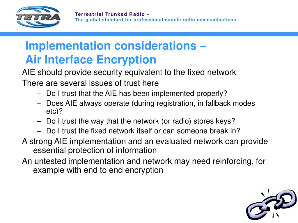 Implementation considerations – Air Interface Encryption • AIE should provide security equivalent to the fixed network • There are several issues of trust here • Do I trust that the AIE has been implemented properly? • Does AIE always operate (during registration, in fallback modes etc)? • Do I trust the way that the network (or radio) stores keys? • Do I trust the fixed network itself or can someone break in? • A strong AIE implementation and an evaluated network can provide essential protection of information • An untested implementation and network may need reinforcing, for example with end to end encryption