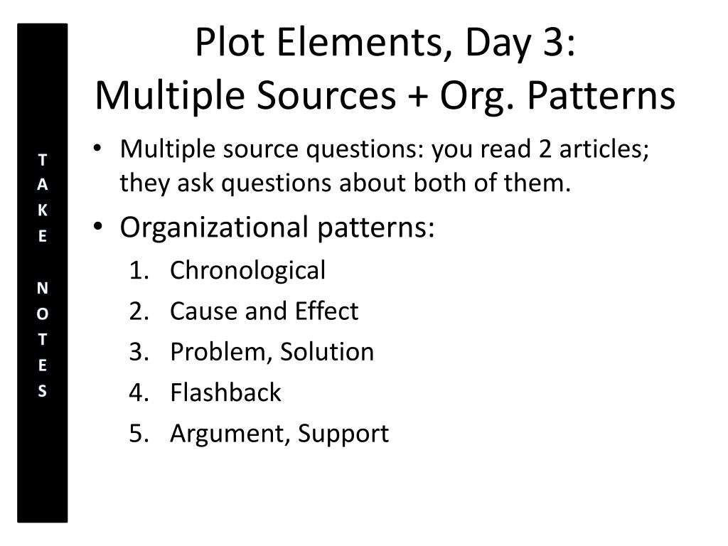 Plot Elements, Day 3:Multiple Sources + Org. Patterns Multiple source questions: you read 2 articles; they ask questions about both of them. Organizational patterns: Chronological Cause and Effect Problem, Solution Flashback Argument, Support TAKE NOTES