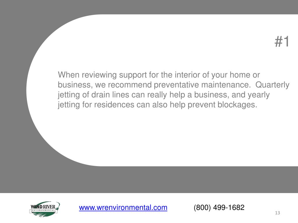 #1 When reviewing support for the interior of your home or business, we recommend preventative maintenance. Quarterly jetting of drain lines can really help a business, and yearly jetting for residences can also help prevent blockages. www.wrenvironmental.com (800) 499-1682 13 13