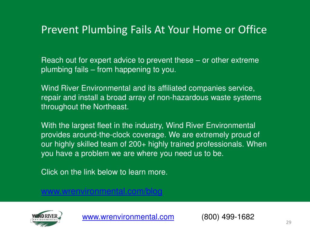 Prevent Plumbing Fails At Your Home or Office Reach out for expert advice to prevent these – or other extreme plumbing fails – from happening to you. Wind River Environmental and its affiliated companies service, repair and install a broad array of non-hazardous waste systems throughout the Northeast. With the largest fleet in the industry, Wind River Environmental provides around-the-clock coverage. We are extremely proud of our highly skilled team of 200+ highly trained professionals. When you have a problem we are where you need us to be. Click on the link below to learn more. www.wrenvironmental.com/blog www.wrenvironmental.com (800) 499-1682 29