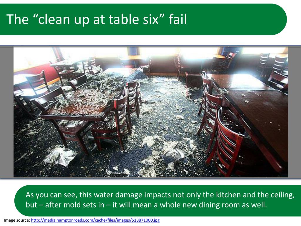 The “clean up at table six” fail As you can see, this water damage impacts not only the kitchen and the ceiling, but – after mold sets in – it will mean a whole new dining room as well. Image source: http://media.hamptonroads.com/cache/files/images/518871000.jpg