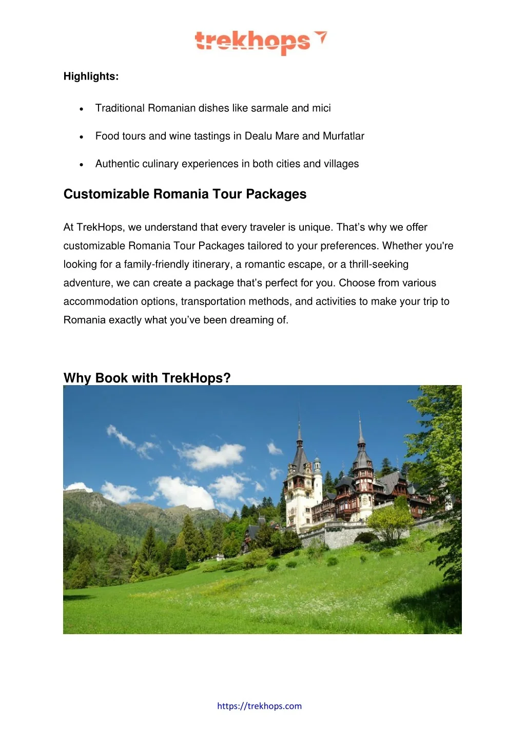 Highlights: •Traditional Romanian dishes like sarmale and mici •Food tours and wine tastings in Dealu Mare and Murfatlar •Authentic culinary experiences in both cities and villages Customizable Romania Tour Packages At TrekHops, we understand that every traveler is unique. That’s why we offer customizable Romania Tour Packages tailored to your preferences. Whether you're looking for a family-friendly itinerary, a romantic escape, or a thrill-seeking adventure, we can create a package that’s perfect for you. Choose from various accommodation options, transportation methods, and activities to make your trip to Romania exactly what you’ve been dreaming of. Why Book with TrekHops? https://trekhops.com