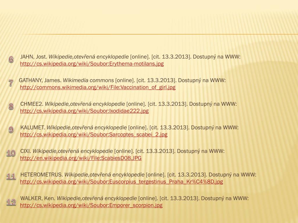 JAHN, Jost. Wikipedie,otevřená encyklopedie [online]. [cit. 13.3.2013]. Dostupný na WWW: http://cs.wikipedia.org/wiki/Soubor:Erythema-motilans.jpg GATHANY, James. Wikimediacommons [online]. [cit. 13.3.2013]. Dostupnýna WWW: http://commons.wikimedia.org/wiki/File:Vaccination_of_girl.jpg CHMEE2. Wikipedie,otevřená encyklopedie [online]. [cit. 13.3.2013]. Dostupný na WWW: http://cs.wikipedia.org/wiki/Soubor:Ixodidae222.jpg KALUMET. Wikipedie,otevřená encyklopedie [online]. [cit. 13.3.2013]. Dostupný na WWW: http://cs.wikipedia.org/wiki/Soubor:Sarcoptes_scabei_2.jpg CIXI. Wikipedie,otevřená encyklopedie [online]. [cit. 13.3.2013]. Dostupný na WWW: http://en.wikipedia.org/wiki/File:ScabiesD08.JPG HETEROMETRUS. Wikipedie,otevřená encyklopedie [online]. [cit. 13.3.2013]. Dostupný na WWW: http://cs.wikipedia.org/wiki/Soubor:Euscorpius_tergestinus_Praha_Kr%C4%8D.jpg WALKER, Ken. Wikipedie,otevřená encyklopedie [online]. [cit. 13.3.2013]. Dostupný na WWW: http://cs.wikipedia.org/wiki/Soubor:Emporer_scorpion.jpg 6 7 8 9 10 11 12