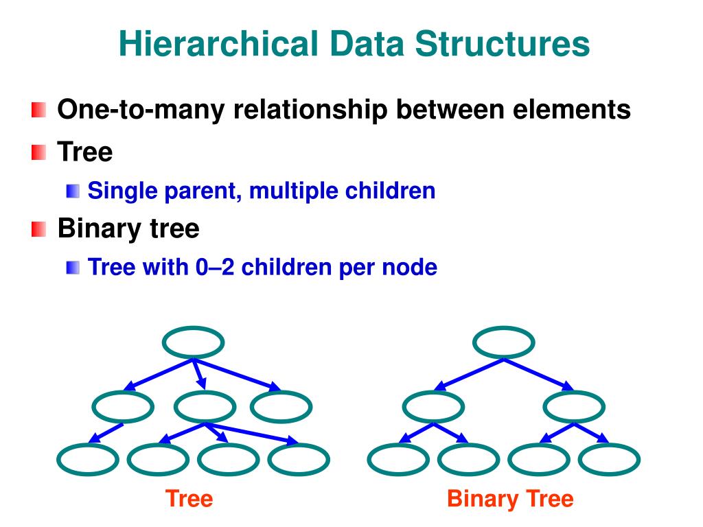 Hierarchical Data Structures • One-to-many relationship between elements • Tree • Single parent, multiple children • Binary tree • Tree with 0–2 children per node Tree Binary Tree