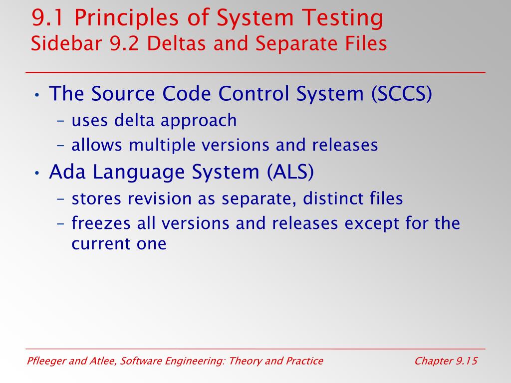9.1 Principles of System TestingSidebar 9.2 Deltas and Separate Files • The Source Code Control System (SCCS) • uses delta approach • allows multiple versions and releases • Ada Language System (ALS) • stores revision as separate, distinct files • freezes all versions and releases except for the current one