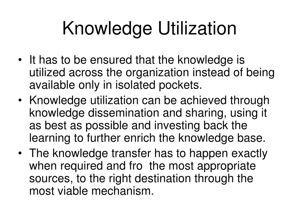 Knowledge Utilization • It has to be ensured that the knowledge is utilized across the organization instead of being available only in isolated pockets. • Knowledge utilization can be achieved through knowledge dissemination and sharing, using it as best as possible and investing back the learning to further enrich the knowledge base. • The knowledge transfer has to happen exactly when required and fro the most appropriate sources, to the right destination through the most viable mechanism.