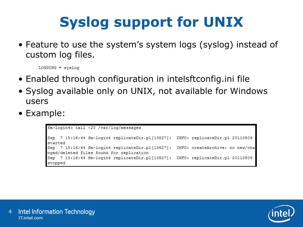Syslog support for UNIX • Feature to use the system’s system logs (syslog) instead of custom log files. • Enabled through configuration in intelsftconfig.ini file • Syslog available only on UNIX, not available for Windows users • Example: