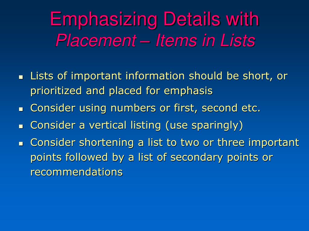 Emphasizing Details with Placement – Items in Lists • Lists of important information should be short, or prioritized and placed for emphasis • Consider using numbers or first, second etc. • Consider a vertical listing (use sparingly) • Consider shortening a list to two or three important points followed by a list of secondary points or recommendations