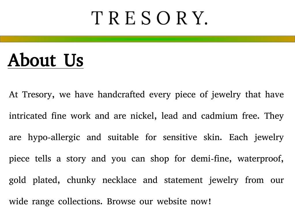 About Us At Tresory, we have handcrafted every piece of jewelry that have intricated fine work and are nickel, lead and cadmium free. They are hypo-allergic and suitable for sensitive skin. Each jewelry piece tells a story and you can shop for demi-fine, waterproof, gold plated, chunky necklace and statement jewelry from our wide range collections. Browse our website now!