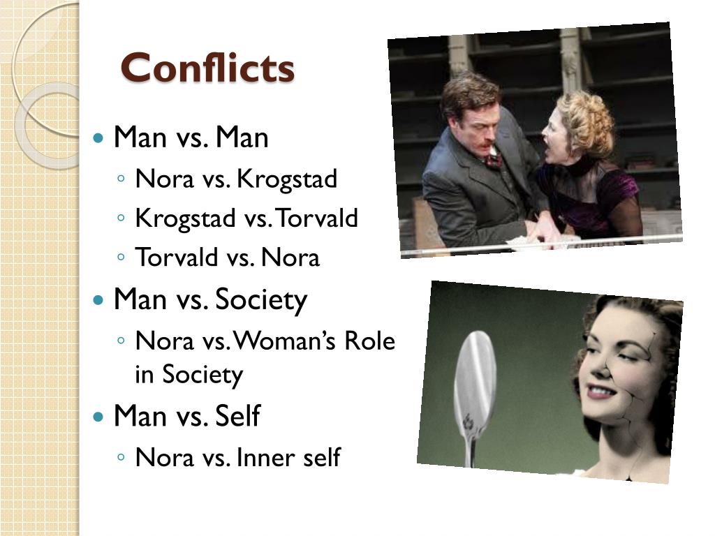 Conflicts • Man vs. Man • Nora vs. Krogstad • Krogstad vs. Torvald • Torvald vs. Nora • Man vs. Society • Nora vs. Woman’s Role in Society • Man vs. Self • Nora vs. Inner self