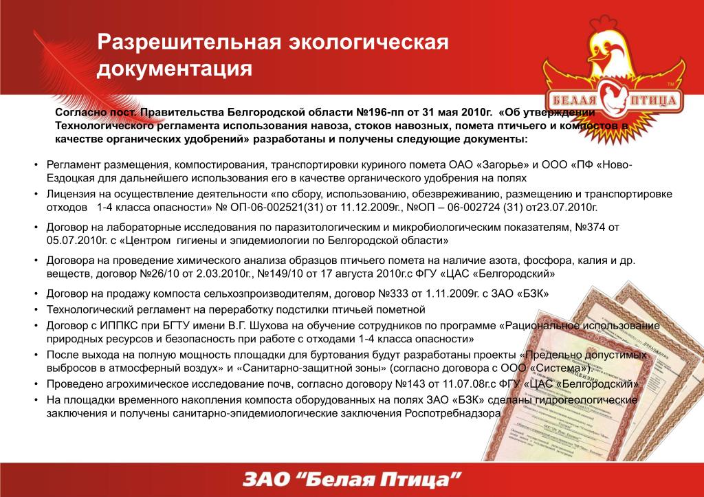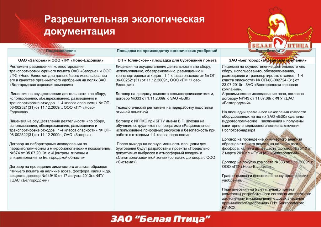 Разрешительная экологическая документация Согласно пост. Правительства Белгородской области №196-пп от 31 мая 2010г. «Об утверждении Технологического регламента использования навоза, стоков навозных, помета птичьего и компостов в качестве органических удобрений» разработаны и получены следующие документы: