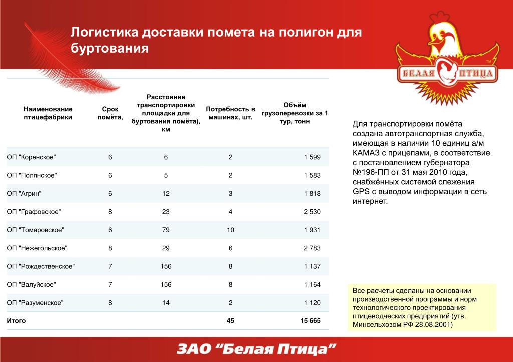 Логистикадоставки помета на полигон для буртования Для транспортировки помёта создана автотранспортная служба, имеющая в наличии 10 единиц а/м КАМАЗ с прицепами, в соответствие с постановлением губернатора№196-ПП от 31 мая 2010 года, снабжённых системой слежения GPS с выводом информации в сеть интернет. Все расчеты сделаны на основании производственной программы и норм технологического проектирования птицеводческих предприятий (утв. Минсельхозом РФ 28.08.2001)