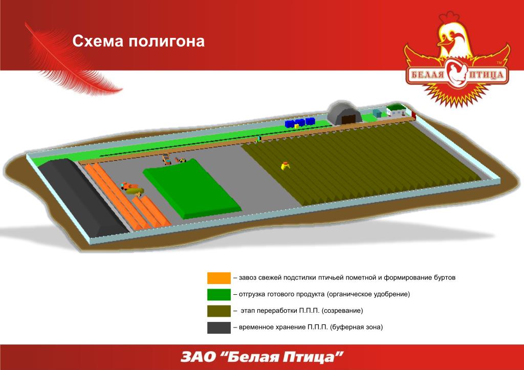 Схема полигона – завоз свежей подстилки птичьей пометной и формирование буртов – отгрузка готового продукта (органическое удобрение) – этап переработки П.П.П. (созревание) – временное хранение П.П.П. (буферная зона)