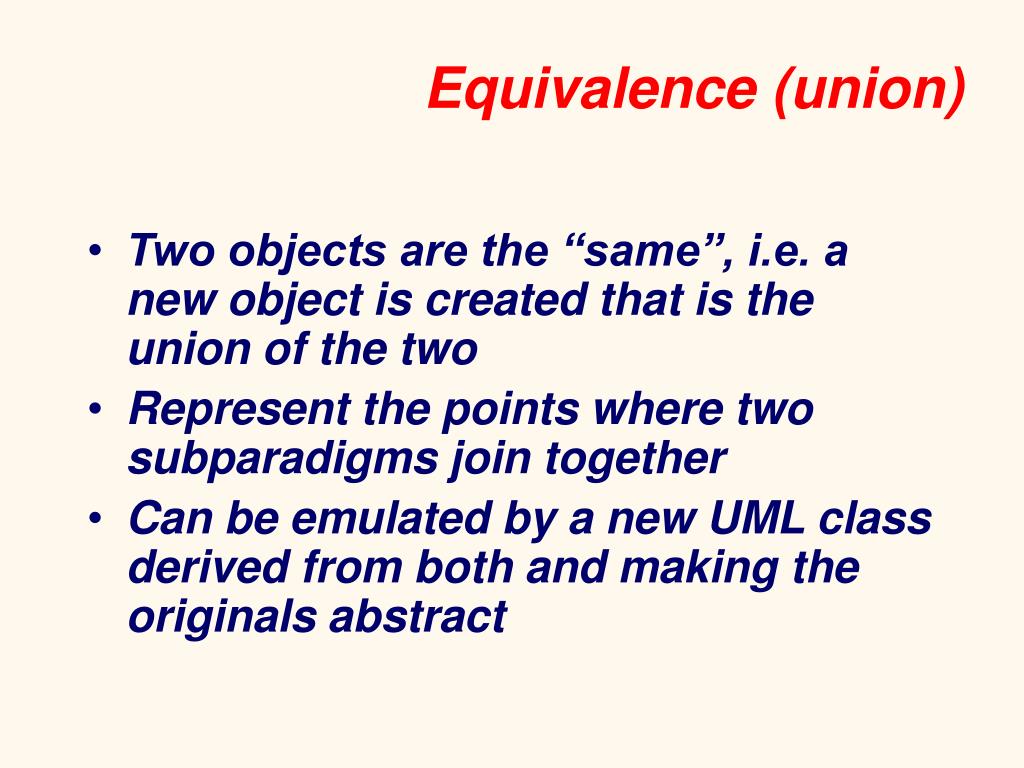 Equivalence (union) • Two objects are the “same”, i.e. a new object is created that is the union of the two • Represent the points where two subparadigms join together • Can be emulated by a new UML class derived from both and making the originals abstract