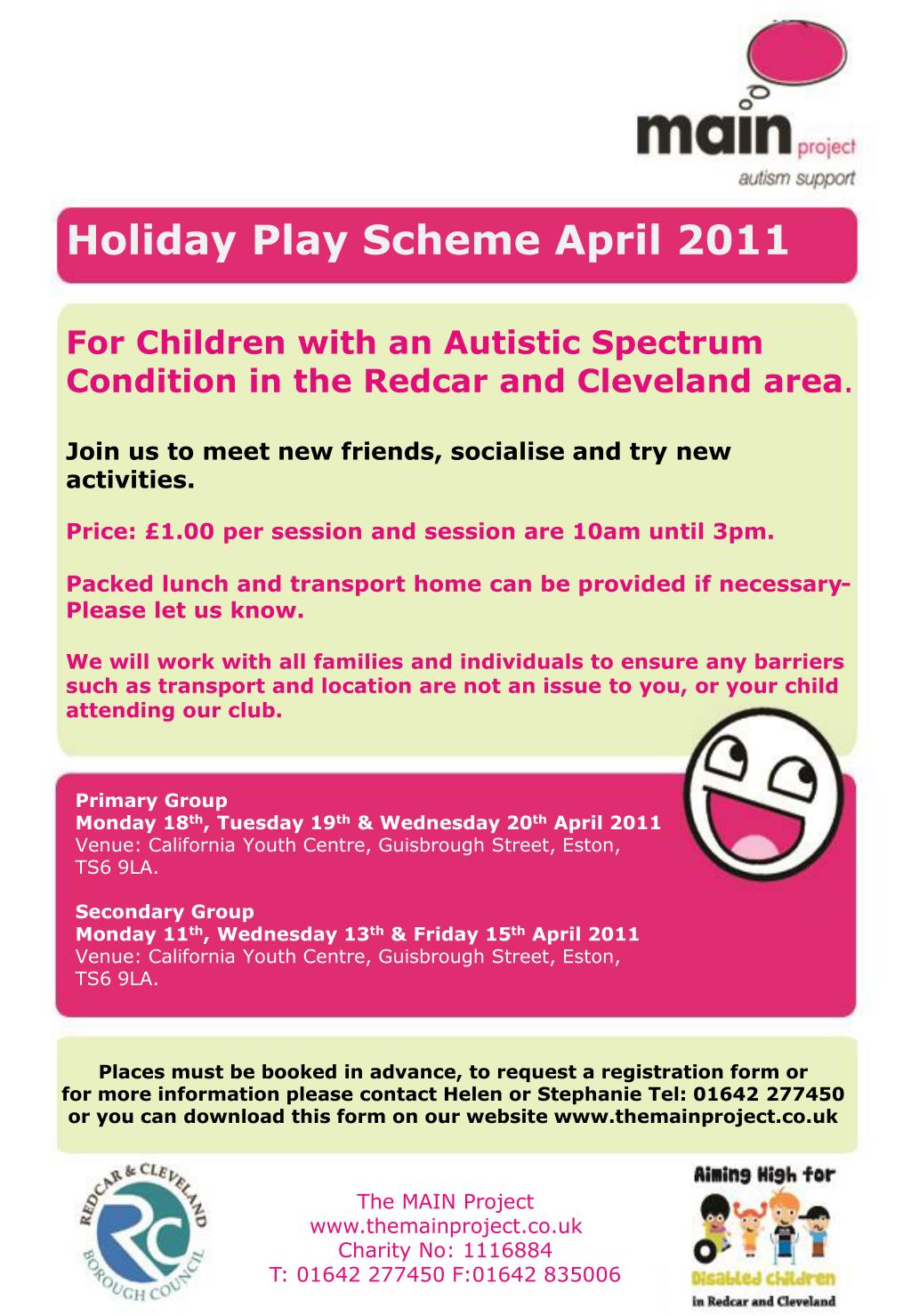Holiday Play Scheme April 2011 For Children with an Autistic Spectrum Condition in the Redcar and Cleveland area. Join us to meet new friends, socialise and try new activities. Price: £1.00 per session and session are 10am until 3pm. Packed lunch and transport home can be provided if necessary- Please let us know. We will work with all families and individuals to ensure any barriers such as transport and location are not an issue to you, or your child attending our club. Primary Group Monday 18th, Tuesday 19th & Wednesday 20th April 2011 Venue: California Youth Centre, Guisbrough Street, Eston, TS6 9LA. Secondary Group Monday 11th, Wednesday 13th & Friday 15th April 2011 Venue: California Youth Centre, Guisbrough Street, Eston, TS6 9LA. Places must be booked in advance, to request a registration form or for more information please contact Helen or Stephanie Tel: 01642 277450 or you can download this form on our website www.themainproject.co.uk The MAIN Project www.themainproject.co.uk Charity No: 1116884 T: 01642 277450 F:01642 835006