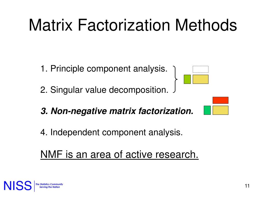 Matrix Factorization Methods • Principle component analysis. • Singular value decomposition. • Non-negative matrix factorization. • Independent component analysis. • NMF is an area of active research.