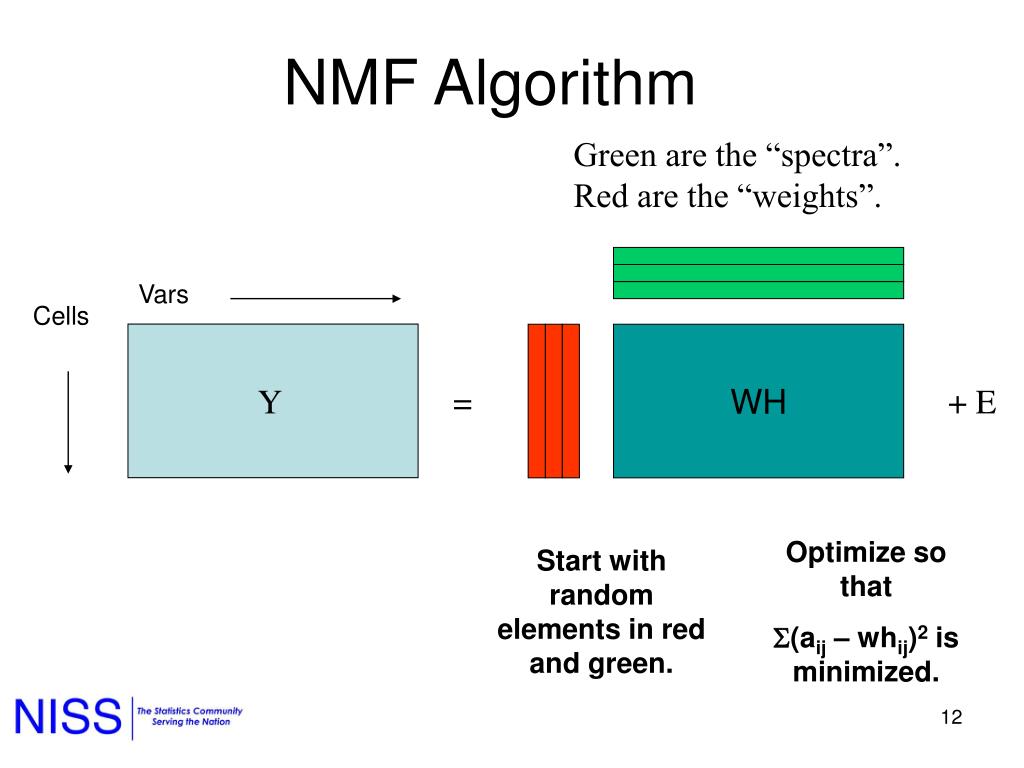 WH = + E NMF Algorithm Green are the “spectra”. Red are the “weights”. Vars Cells Y Optimize so that (aij – whij)2 is minimized. Start with random elements in red and green.