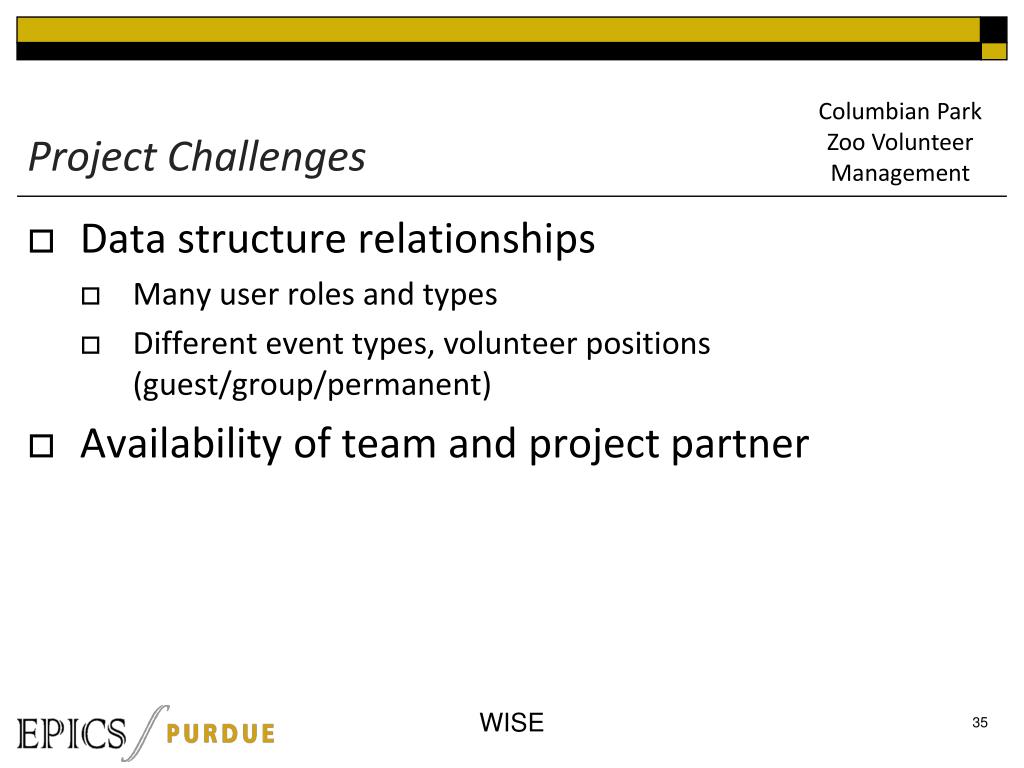 WISE Mission Columbian Park Zoo Volunteer Management The epics WISE team is dedicated to the creation of web based software applications for the community. Every application has to meet the needs of each specific project partner and be assembled in a clean, easy to use fashion. We work to provide a way to take existing organizational processes and simplify them into a more functional and maintainable interface.
