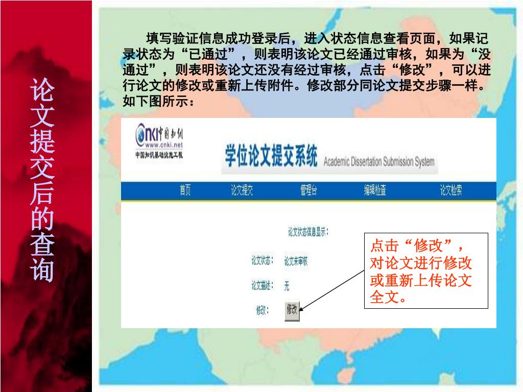 填写验证信息成功登录后,进入状态信息查看页面,如果记录状态为“已通过”,则表明该论文已经通过审核,如果为“没通过”,则表明该论文还没有经过审核,点击“修改”,可以进行论文的修改或重新上传附件。修改部分同论文提交步骤一样。如下图所示: 论文提交后的查询 点击“修改”,对论文进行修改或重新上传论文全文。