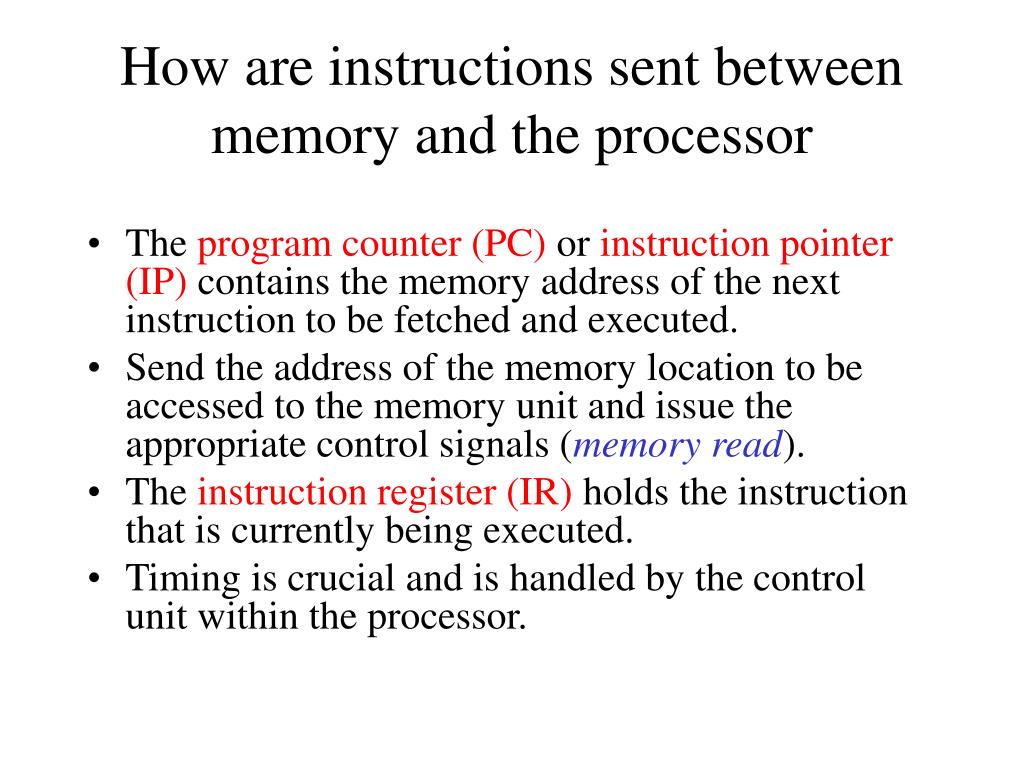 How are instructions sent between memory and the processor • The program counter (PC) or instruction pointer (IP) contains the memory address of the next instruction to be fetched and executed. • Send the address of the memory location to be accessed to the memory unit and issue the appropriate control signals (memory read). • The instruction register (IR) holds the instruction that is currently being executed. • Timing is crucial and is handled by the control unit within the processor.