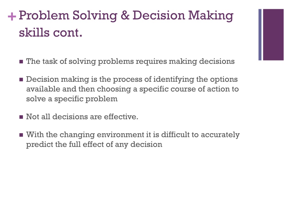 Problem Solving & Decision Making skills cont. • The task of solving problems requires making decisions • Decision making is the process of identifying the options available and then choosing a specific course of action to solve a specific problem • Not all decisions are effective. • With the changing environment it is difficult to accurately predict the full effect of any decision