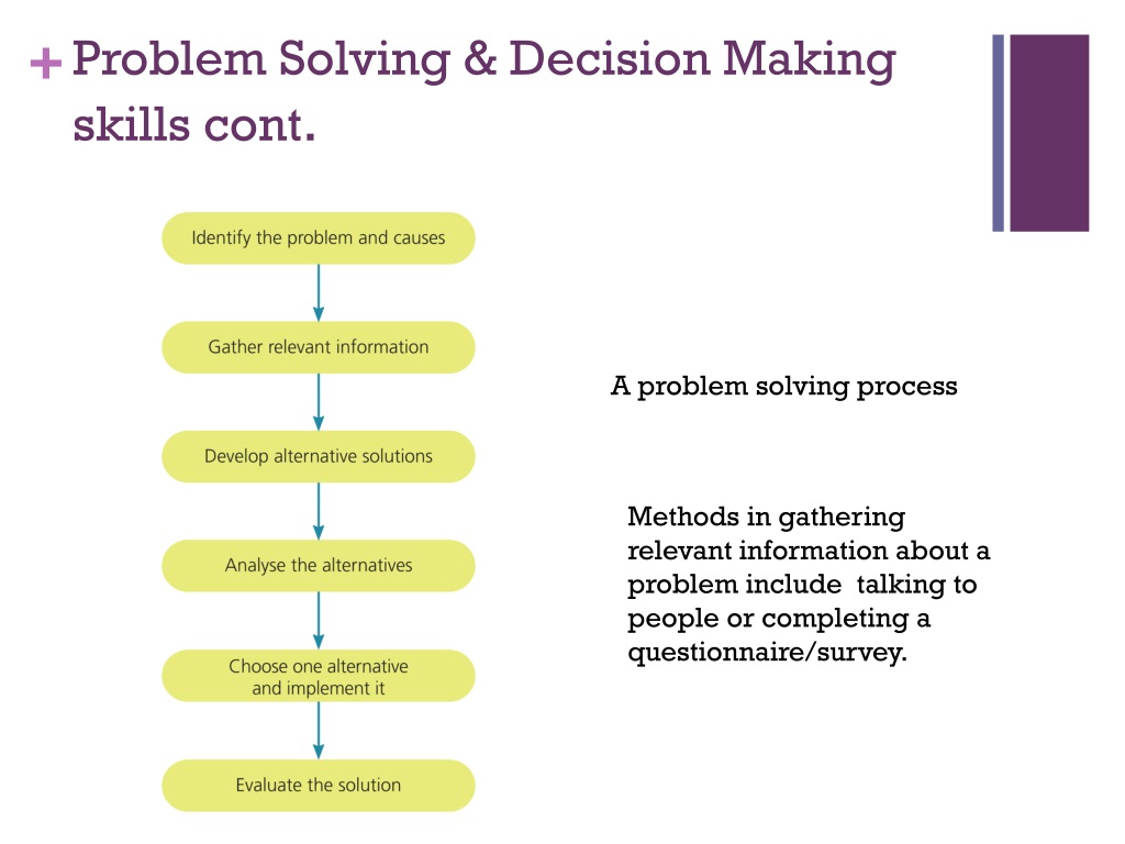 Problem Solving & Decision Making skills cont. A problem solving process Methods in gathering relevant information about a problem include talking to people or completing a questionnaire/survey.